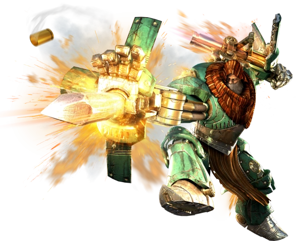 He doesn't use a fighting style and attacks in any way possible. From basic punches to throwing his cybernetic body straight into a swarm of enemies he is a brawler through and through. His normal combo isn't too impressive but his power attacks have good tracking, decent range, and high damage. He can grab 2 enemies at once by their legs, spinning around, lifting them up and slamming them down. This makes him extremely efficient at destroying swarms of drones. His killer weapons are a pair of pile bunkers built into his cybernetic arms. The attack string for them is open palm strike with one side, then the other, then both at once. It feels powerful but he lacks a 4th hit. His power attack is to grab the opponent by the head and fire the pile multiple time then letting go as the pile launches the enemy away.